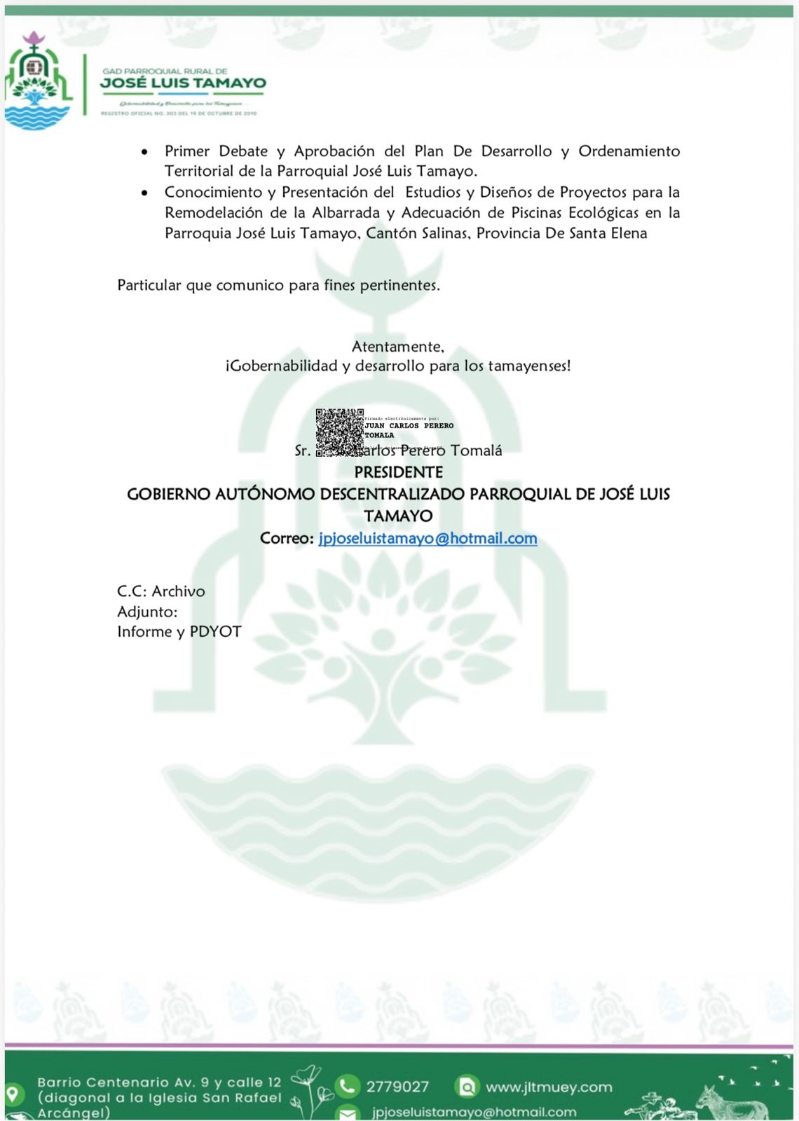 • Conocimiento del Informe de Recomendaciones suscrito por la Lcda. Ximena Muñoz Técnica de Planificación (e) del Plan De Desarrollo y Ordenamiento Territorial de la Parroquia José Luis Tamayo.
