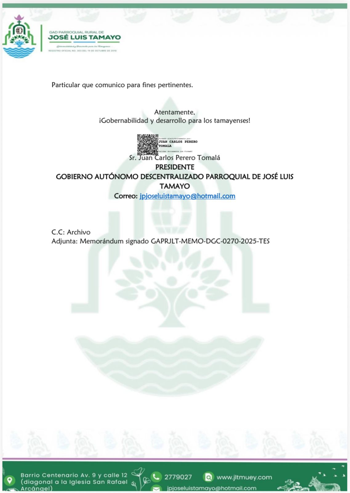 De conformidad con el Art. 319.- Sesión Extraordinaria CÓDIGO ORGÁNICO DE ORGANIZACIÓN TERRITORIAL, (COOTAD), se convoca a ustedes a la SESION Extraordinaria correspondiente al MES DE NOVIEMBRE DEL 2025, la misma que se efectuará bajo los siguientes detalles: MARTES 25 DE NOVIEMBRE DEL 2025, A LAS 11:00 am, en la Sala de Sesiones del Gad Parroquial Rural de José Luis Tamayo.